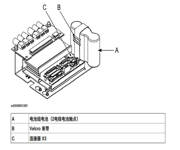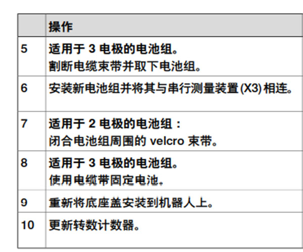 注意:當(dāng)需要更換電池時,將會顯示電池低電量警告(38213 電池電量低)。建議在電池 更換完畢前保持控制器電源打開,以避免機器人不同步。 對于具有 3 電極觸點的 SMB 電路板(RMU101 3HAC044168-001 或 RMU102 3HAC043904-001),新電池的壽命通常是 36 個月。 對于具有2極電池觸點的SMB板,如果機械手?jǐn)嚯?天/周,新電池的通常壽命為36個 月;如果機械手?jǐn)嚯?6小時/天,則為18個月。通過電池停機維護程序,可延長壽命 以延長生產(chǎn)中斷時間。