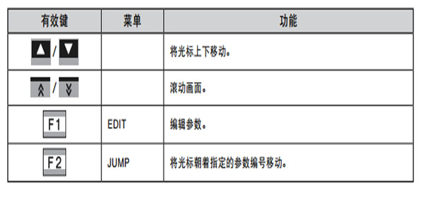 機(jī)器人參數(shù)編輯時(shí)的有效鍵及子菜單的內(nèi)容如下。